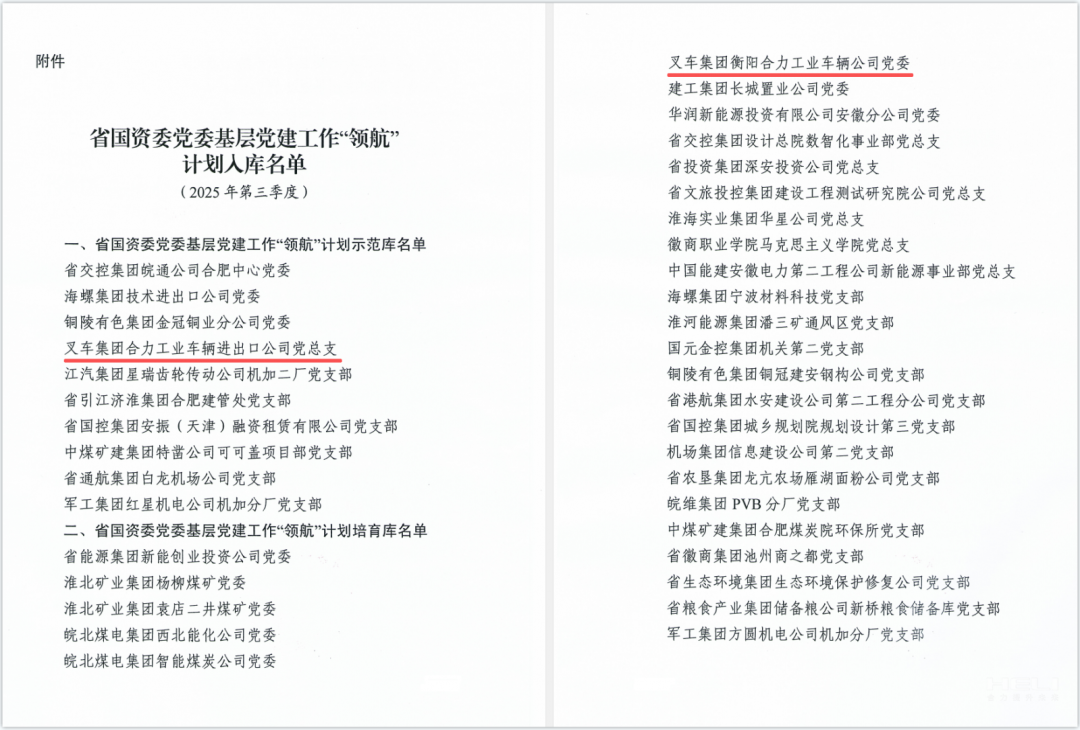 日前,安徽省國資委黨委印發(fā)2025年第三季度基層黨建工作“領航”計劃入庫情況的通報,省屬企業(yè)共有10個基層黨組織入選其示范庫,28個基層黨組織入選其培育庫。其中,安徽叉車集團進出口公司黨總支憑借“同心合力 全球爭先”黨建品牌成功入選示范庫,衡陽合力黨委憑借“紅雁”黨建品牌成功入選培育庫。